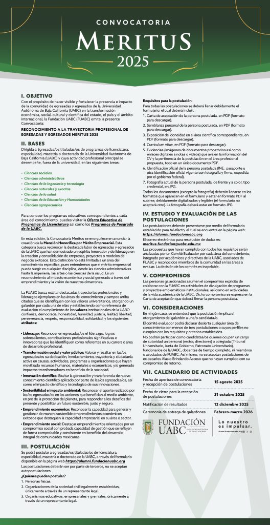 Durante 68 años la UABC ha formado a más de 260,000 estudiantes quienes, con un alto sentido ético y de responsabilidad social, han sido capaces de convertirse en ciudadanos plenamente realizados que asumen el compromiso de mantener en alto el nombre de nuestra Universidad. La Fundación UABC busca reconocer a estas egresadas y egresados y sus trayectorias a través de la convocatoria Meritus